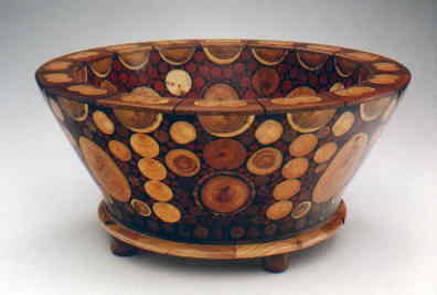 #466 This piece contains about 2400 pieces. All circles made from Purple Heart, Walnut, Cherry, Holly, Black Locust, Tourquise, Ebony and Ficus. It is the mate to #465 (left). 39 " tall x 18" wide